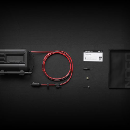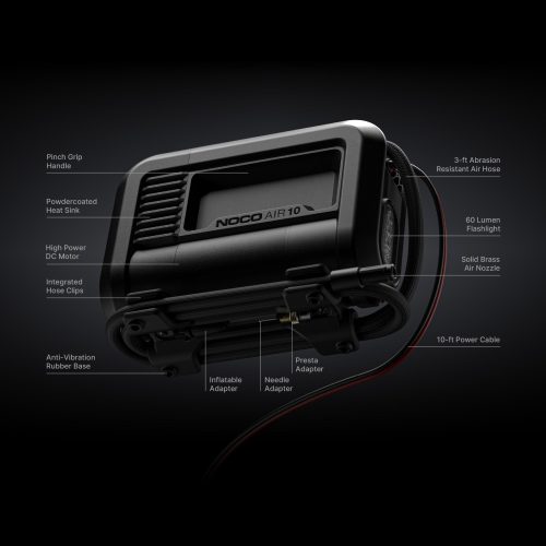 Introducing NOCO AIR10 a 12-volt, 10-amp portable air compressor with a 138-watt motor rated at a maximum pressure of 60 PSI. AIR10 is the next generation of portable air compressors, utilizing advanced motor and airflow design in an unbelievably compact form with uncompromising performance, it runs longer, fills faster, and is infinitely better.