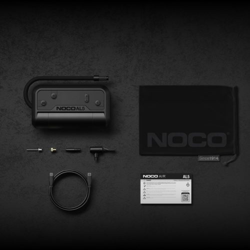 Introducing NOCO AL5 a 12-volt, 5-amp portable air compressor with a 90-watt motor rated at a maximum pressure of 130 PSI. AL5 is the next generation of portable air compressors, utilizing advanced motor and airflow design in an unbelievably compact form with uncompromising performance, it runs longer, fills faster, and is infinitely better.